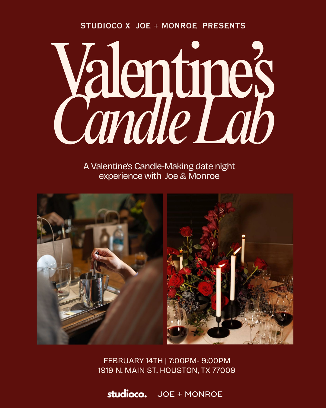 Join us for an elevated candle-making experience led by @joeandmonroe, a premium woman-owned candle brand, in a beautifully styles setting with warm lighting, florals, and cozy, romantic vibes.